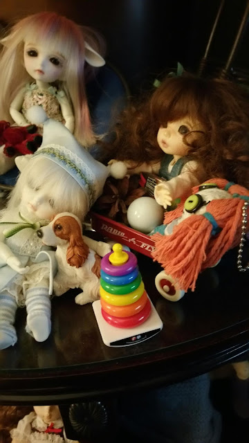 Three of my Pukifees with their toys and/or pets: Joy, in the back with the bear that Beloved bought for Chutzpah. Chutzpah with the zombie doll that Squishy gave her, the ball from the penguin bowling game (out of camera range), and a little red wagon bought on my honeymoon. Praise with her puppy and the miniature Fisher-Price toy that I bought coming home from Tennessee last month.