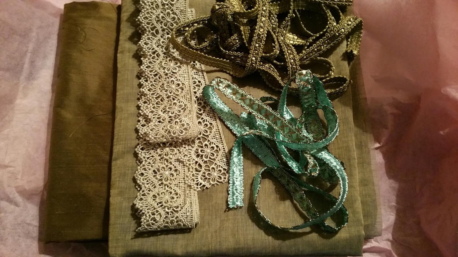 I came home with a yard each of muddy green silk dippioni (which reads as bronze or gold in these pictures) and iridescent cotton voile, plus several yards of lace and trim, and one yard of amazing stuff from trimmed-down feathers. I'm not sure how I'll use the latter, but it called my name. (Trust me, this all tones wonderfully, regardless of what you're seeing on your monitor.)